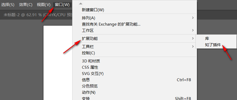 2.打开adobe illustrator cc 2018或者之后的版本,选择菜单:窗口>扩展,选择打开知了插件